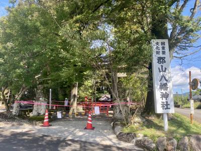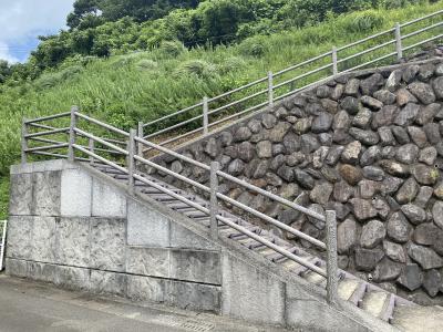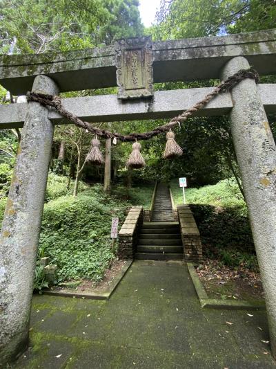 台風被害のせいか、経年劣化によるものかわかりませんが、石鳥居の中央部に亀裂が見られポールで支えられていました。神社名を掘った石も落下していて、鳥居をくぐって入ることはできず立入禁止のロープが張られていました。