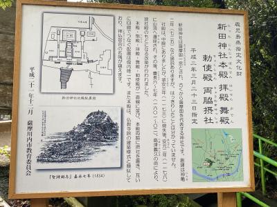 新田の名はニニギノミコトが川内川より水をひいて新しく水田をつくったことに由来するそうです。まずはニノ鳥居をくぐって降来橋を渡ります(一の鳥居は川内川近くにあります)。橋を渡った先の石段が参道ですが、上の方は遠すぎて見えません。300段以上ある石段を登りますが、非常に特別感のある参道なので、車で上まで行ってしまうと、この空気を味わえません。