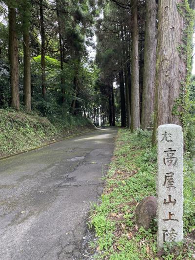 車をとめた空き地先の道路右側には「高屋山上陵」の石碑があります。参道っぽい杉林を登っていくと、車止めがありさらに登ると拝所がありました。宮内庁管轄なので中に入ることはできませんが、独特の神聖な空気が流れています。