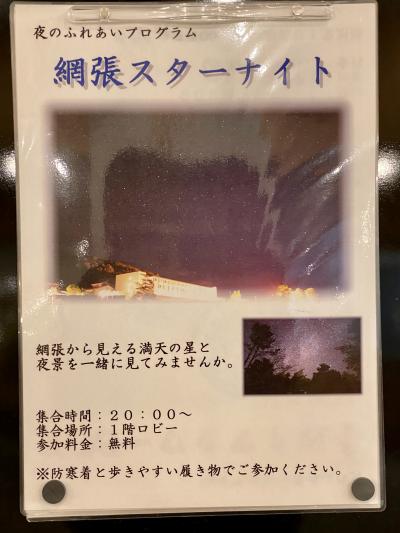 星空が綺麗そうだったので、20時からのスターナイトに参加しました。ロビーを出たところで、満天の星を見ながらスタッフに色々と解説してもらい、わかりやすかったですね肉眼で天の川を見られたのは久しぶりで感動的でした。6名位だけでしたが、ここのロケーションでお天気ならば参加してみてほしいですね。無料ですし。終了後はリフト乗り場前まで歩き、ベンチに寝転がって更に星空を楽しみました。冬ならもっと綺麗だと思います。