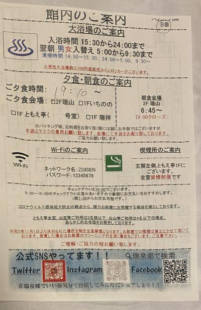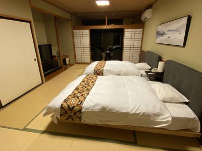 部屋は白山亭(本館)の和室にベッドが置いてあるタイプでした。夜はわかりませんでしたが、朝見ると部屋の前が池のある庭でした。洗面台は2つありました。部屋風呂もありましたが温泉があるので使用していません。セイフティボックスはありました。ポットに入っていた瑞山の里の氷水が美味しかったです。リニューアルされたのか、部屋は和室畳の上にベッドが置いてあるタイプで、全室禁煙のため臭いはありませんでした。喫煙所は玄関横の部屋と、温泉への通路にある部屋の二箇所ありました。