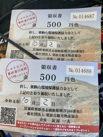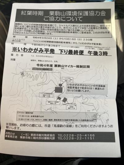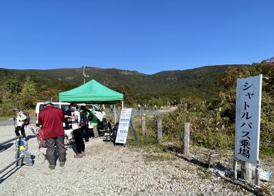 紅葉の時期(2022.9.24-10.16)は沢山の登山客が来るので、マイカーでは上に行けません。くりこま高原温泉郷ハイルザーム栗駒の少し上にある臨時駐車場(無料)に向かいました。シャトルバス乗場に近い駐車場は8:30に着いたら既に満車で、少し下の所にとめました。乗り場からは行列無しでシャトルバス(500円)でいわかがみ平まで送迎してもらいました。