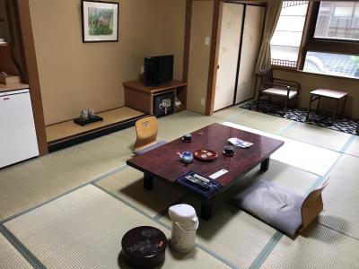 大きな駐車場から入る二階建ての建物は新館で誰もいません。フロント通路と書かれた奥に進むと本館になりフロントがありました。チェックインして精算したら鍵をもらい新館に戻って荷物を部屋に運びました。エレベーターはありません。喫煙室で予約していたのに2階の禁煙室になっていたので、フロントに言って変更してもらいました。1階の喫煙室はベッドの布団をシングル分しか準備していないと言うことで、夕食を食べに行っている間に準備してもらいました。