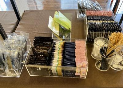 ロビーにあるコーヒーパック、ティーバッグなどは必要ならもらうシステム。枕は通常のは部屋にありますが、変えたいなら各階にある枕、部屋着、浴衣、スボンプレッサーの棚から必要なものを持って行きます。