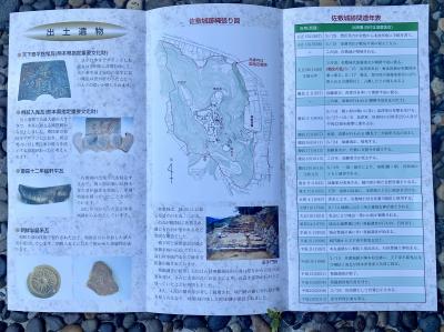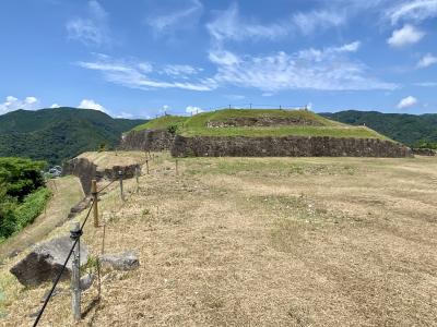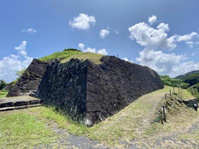 本丸跡に建てられたビジターセンターは2022年9月16日まで施設改修工事のため休館中の看板が、駐車場前に立っていました。整備された遊歩道を上まで登って、ぐるりと1 周してみました。すぐに復元された綺麗な石垣が見えてきます。時代を経て三重の石垣になったようです。途中にある歴史資料館(有料)はオープンしてました。