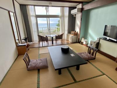 下田温泉で海に面しているのはここだけ。夕陽がみられるかもしれないと考えてコチラにしました。ただし海側の部屋は高いので山側にして、夕食時にレストランから見られれば良いかなと思っていましたが、チェックイン時に海側の部屋にグレードアップしてもらえたのでラッキーでした(リピーター狙いでしょうか)。ただし雲が多くて綺麗なサンセットは拝めませんでした。部屋はそれほど広くなく質素な作りでしたが、畳の縁がカラフルでお洒落でした。