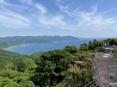 引き返すと、駐車場の端に別の展望台の看板があったので、坂を登って行きました。滝とは、ちょっと距離感が遠くなりました。山の方を見ると、一つだけ岩肌があらわなモッチョム岳などが見えました。海側を眺めると原港などが見られます。- 旅行時期