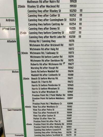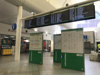 最後に電光掲示板を見て行先、出発時刻、路線番号、乗り場を確認し、1階の乗り場に向かいました。乗り場の看板には、停車駅が順番に全て記載されていました。タイムテーブル冊子には全てのバス停の時刻が出ておらず大雑把。下車するバス停の手前の方の番号、バス停名を知っておき、下車のタイミングを知るためにスマホで写しておきました。