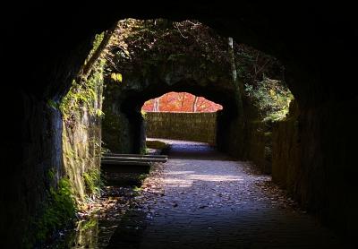 遊歩道をくだって川の方に行く通路も、最後にトンネルのような部分もあり、いい雰囲気があります。視線の先には、新曽木大橋が見えます。