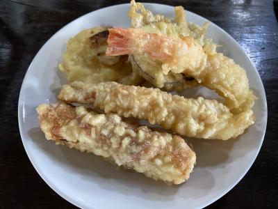 店に入った時は、一番乗りでした。それでもおばあちゃん一人でされているため時間がかかります。20分ほど待って、ざる蕎麦、天ぷらが来ました。蕎麦を茹でてるのを忘れてしまったかのように、のびのびでブヨブヨでした。まあこれも愛嬌と思っていただきました。天ぷらは、衣が分厚く鹿児島名物ガネみたいな感じで美味しかったです。えび2尾、ちくわ、なす、玉ねぎとボリュウムがありました。他にマカロニ、大根のなます、たくわんの小皿付き。
