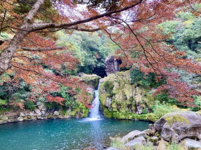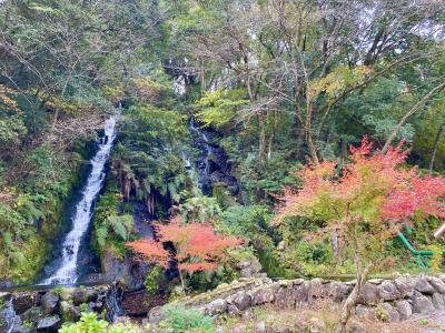 川沿いを右に進むと、「鴛鴦(オシドリ)の滝」がありました。二つの流れの間にはシダ類もあって南国の中で見る紅葉という珍しい景観でした。
