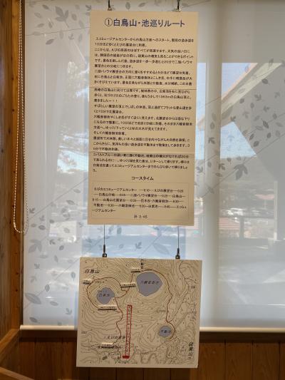 白鳥山(1363m)までは、エコミュージアムセンター前の駐車場をスタートして1時間弱なので初心者向きです。ただし普段歩き慣れてない人には坂道はしんどいのかも。スニーカーでは厳しいので一応登山靴が必要です。