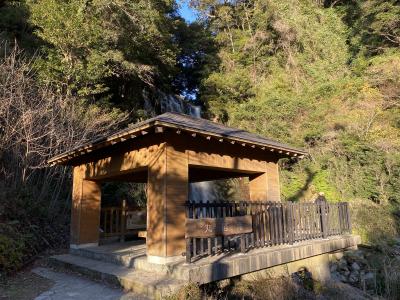 駐車場からくだる途中の山沿いに最初の滝があります。ただの水路みたいに見えますが「お清めの滝」です。