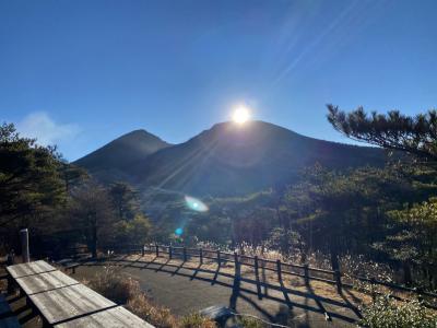 歩き始めてすぐの、えびの高原展望台に来ると鹿が2頭いました。途中で太陽が韓国岳山頂付近から現れパワーをいただきました。白鳥山との分岐点を通過し、六観音堂までが50分。アカマツ群生地を抜けて不動池少し手前の甑岳への分岐点までは、スタートしてから1時間13分。樹林帯を抜けると坂道が続き、残り50mの標識からは足をあげるのも辛くなってきて、かなり登山っぽくなりました。スタートして2時間16分で1301mの甑岳頂上に到着。63歳、62歳の夫婦としては上出来のタイムでした。