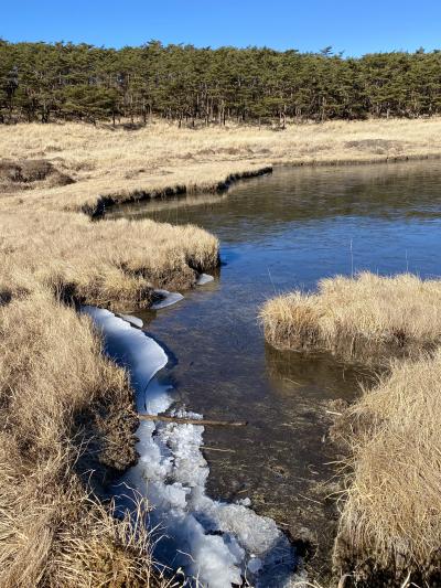 頂上の木々の窪みから火口側を覗くと、中の湿地帯がよく見えました。火口縁の周回コースは40分で、途中に三角点もありますが、周回ルート1周は行かず火口湿原だけ行ってみました。クレーター内に湿原があるって珍しいですからね。少し急な坂をくだると湿原の端に出ます。道があるような無いような、どこでも自由に歩けますが、踏み跡をたどって行けば水のある沼に行けます。一部は厚い氷が張っていました。頂上から湿原往復は25分くらいでした。