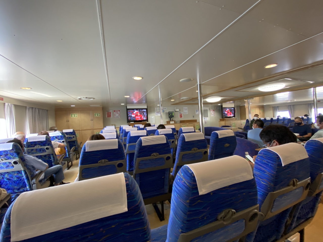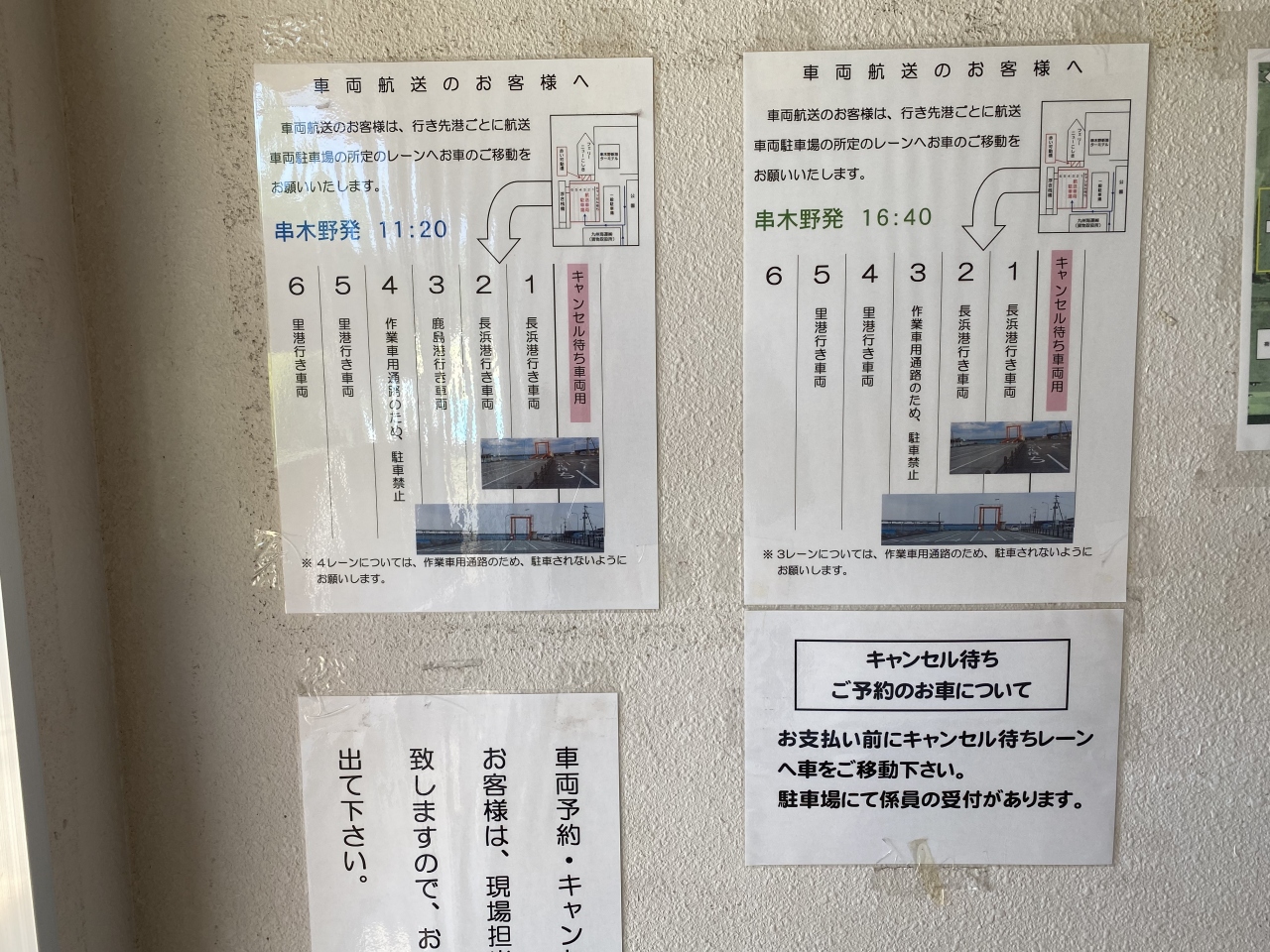 フェリー会社のHPでは1時間前までに来るように記載されていましたので、それより少し早め向かいました。串木野新港に着いたら、係員の誘導で6番のレーンに車をとめ、そのあと旅客待合室で受付を行いました。下甑島の長浜港まで行く人は1番レーン。上甑の里港で下船する人は5番、6番レーンでした。