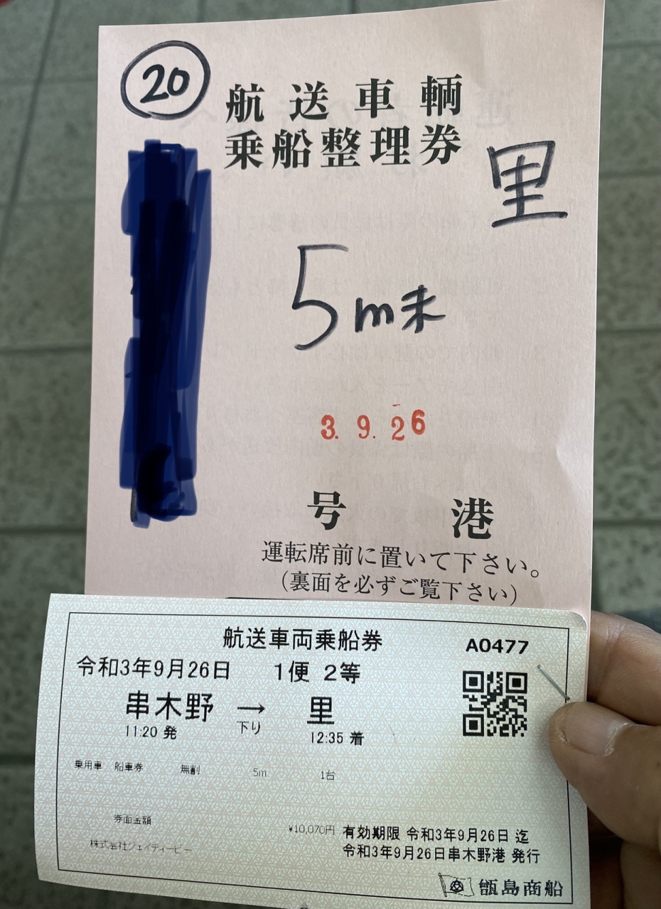 JTBの予約券を受付で見せて車の乗船整理券に交換してもらいました。これを車のダッシュボードにのせて見えるようにします。運転手以外の同乗者は乗船券をもらいますが、下船時には乗船整理券と共に渡すので無くさないように注意が必要です。受付時には車検証のコピーも見せました。車の全長を知るのに必要でした。