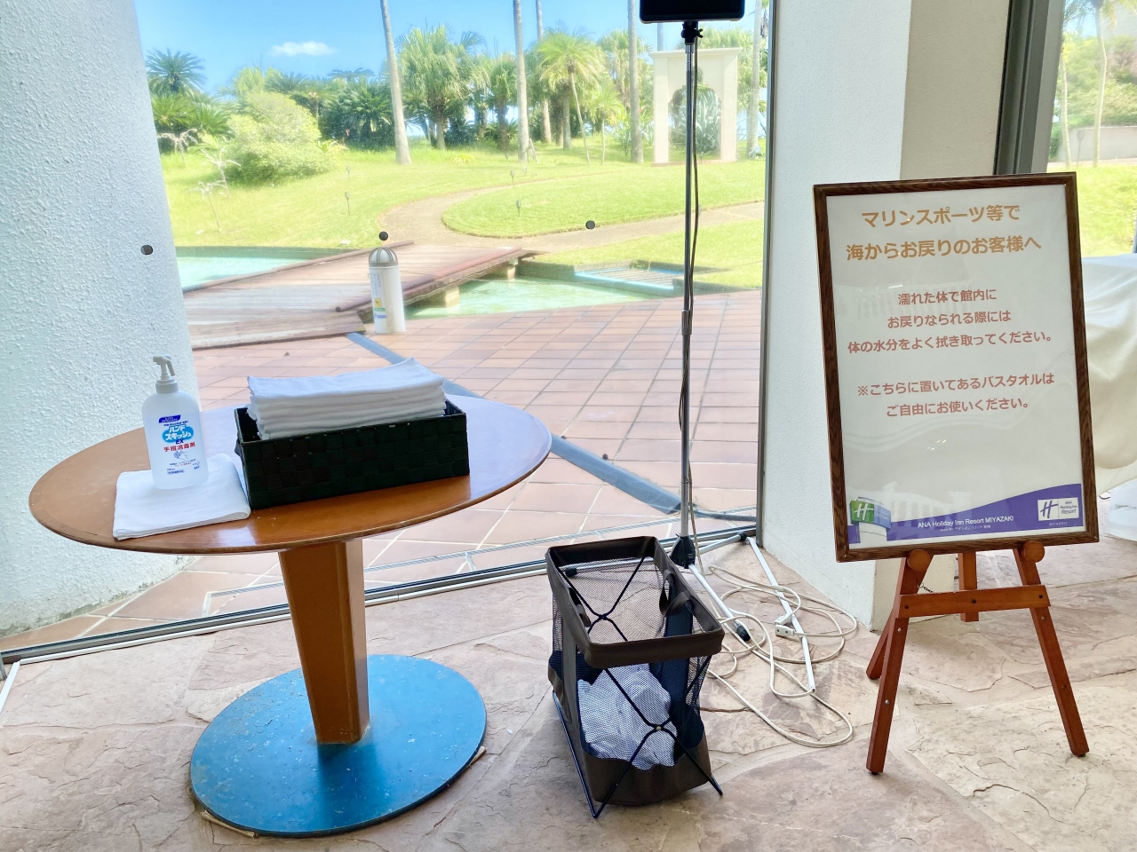 ビーチ用のタオルはないので、自前で持っておく必要がありますが、海から上がって館内に入る時には、体を拭く用のタオルは置いてあります。
