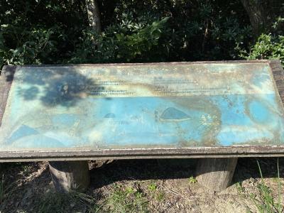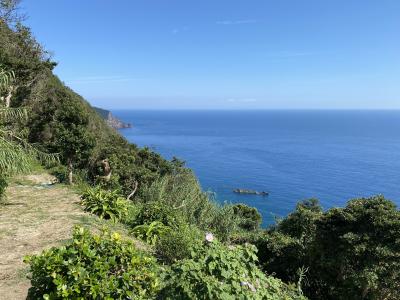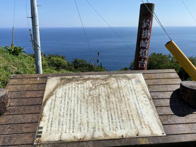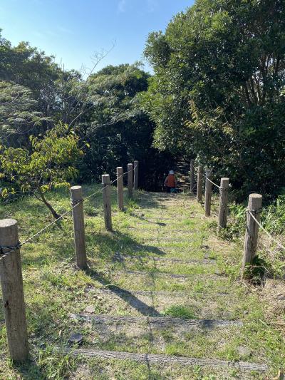 展望所から歩いて奥に遊歩道を進んでみました。説明板は、あいかわらず劣化がひどく、由良島くらいしかわかりません。断崖クルーズ船からみると、海亀や麦わら帽子に見えたりするらしいです。今回はコロナ禍でクルーズは中止中でしたが、10月(2021年)には再開しました。