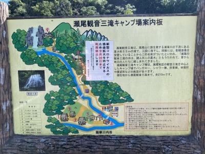 瀬尾観音三滝の看板で349号線かに少し登って行くと、キャンプ場の駐車場がありました。ここから滝までは210mなので、歩いても近いです。歩きたくなければ、少し上にも少し駐車スペースはあります。キャンプ場は予約制で、2021.9月30日まではコロナで閉鎖中でした。