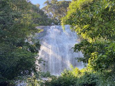三の滝を堪能したら、階段を少し登って二の滝へ。一の滝からの落差を感じられる展望所です。谷間なので真昼しか光が全体には当たりません。一の滝は落下部から外に吹き出す感じ。展望所にも霧のように水が舞っていますが、これは冷気が漂っているだけで、マイナスイオンというものは科学的には証明されていませんよ。私としては、やはり三の滝がナンバーワンかなと感じました。