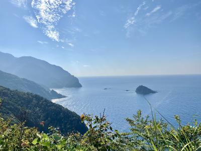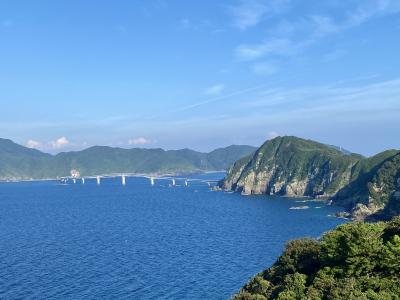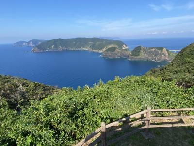 展望台から遊歩道を下って行きました。途中に視界が開ける場所があり、そこからの甑大橋の景観は、湾曲部がよく見えて素晴らしい。遊歩道の先に見える岩場は平瀬崎ですが、帰りは登ることになるので海べりまでは行ってません。