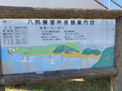展望所からは雄大な地平線を味わいました。甑島の観光スポットにある説明板は、劣化が酷くて読めない物が多かったです。灯台の左側は、草ぼうぼう過ぎて風景がよく見えません(笑)。