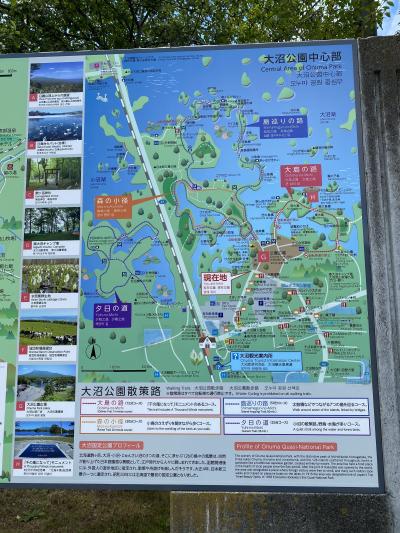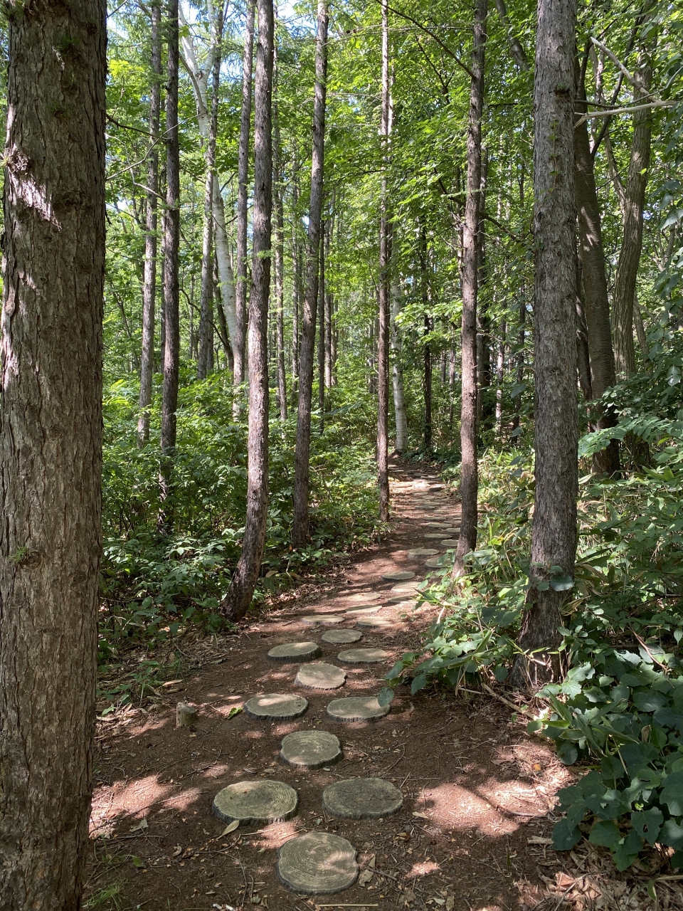 青のコース(約50分)を歩こうと思いましたが、今年の北海道は異常に暑いので、短い赤のコース(約15分)にしました。途中には、駒ヶ岳が美しく見えるポイント、「千の風になって」ゆかりの地のモニュメントなどあります。