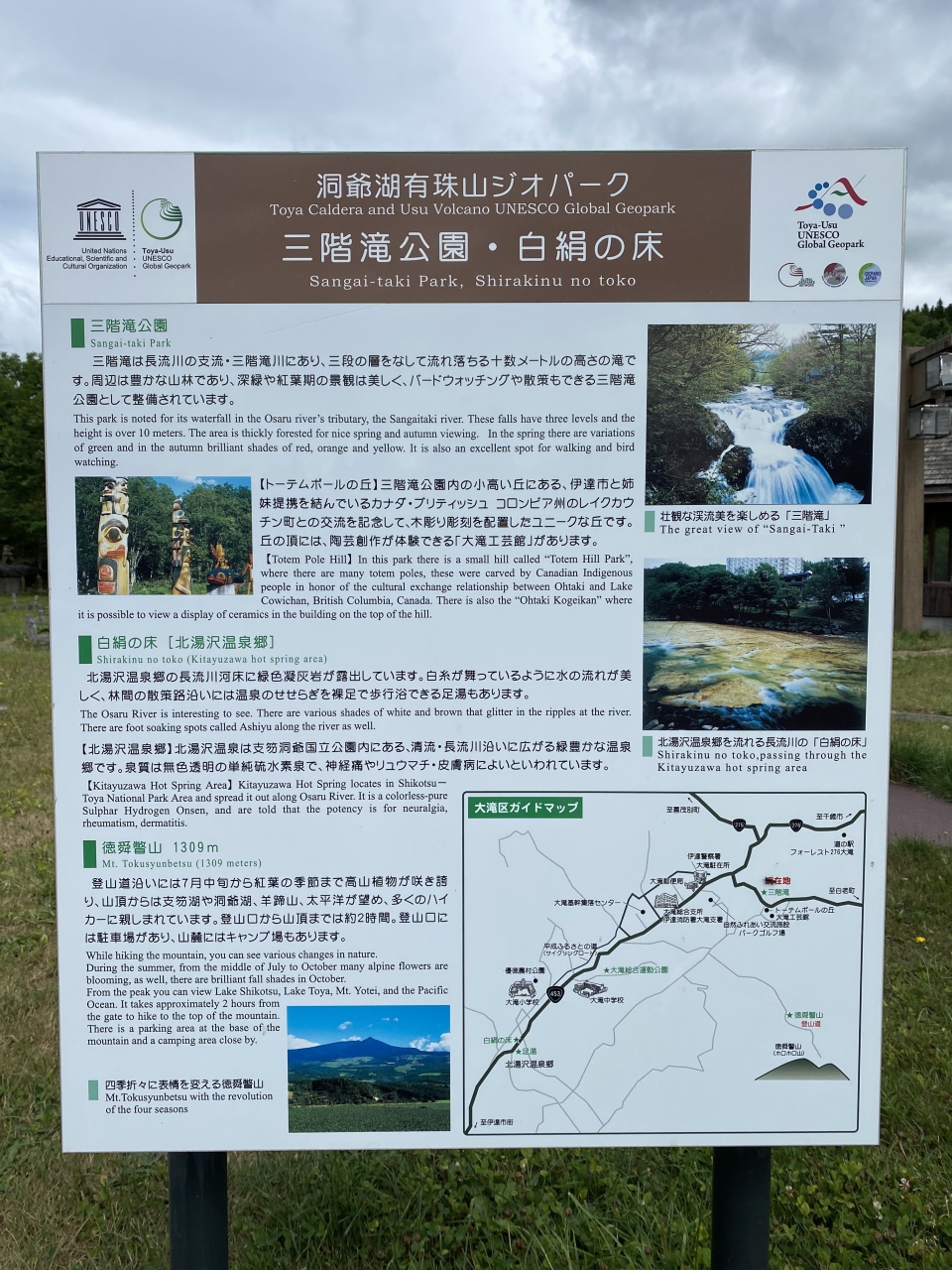 トーテムポールがあったり、ウッディなトイレがあり、トーテムポールと反対方向にあるカフェの前の坂を下ると三階滝があります。