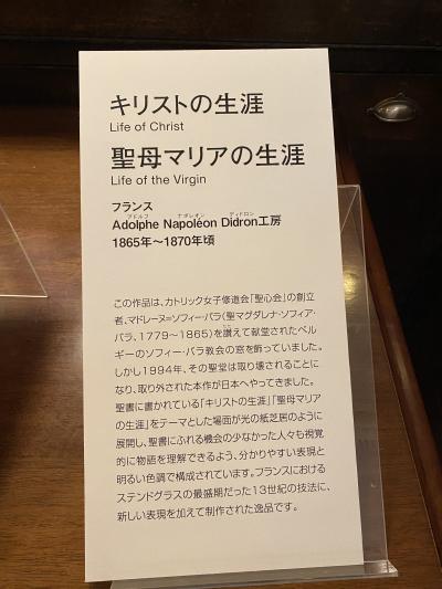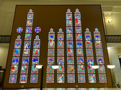 ロビーのベルギーから持ってきたというステンドグラスは美しい。