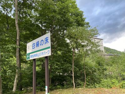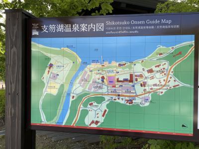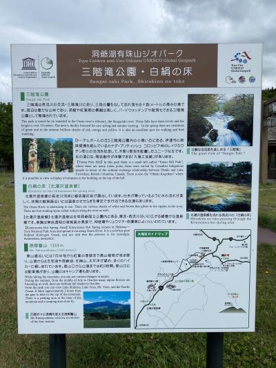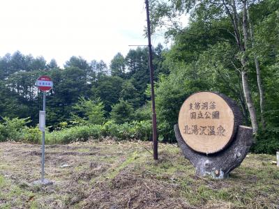 支笏湖から洞爺湖に移動する際、453線沿いに看板を見つけ停車しました。川の向こう側には大きなホテルが見えてました。北湯沢温泉の木製看板の前にバス停があり、横に駐車スペースがありました。