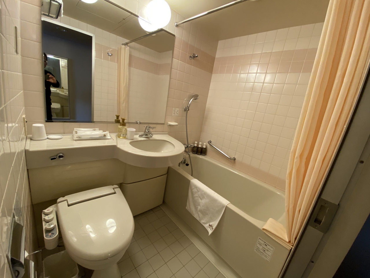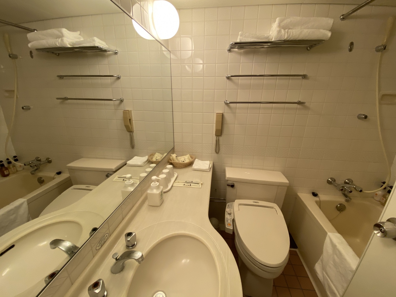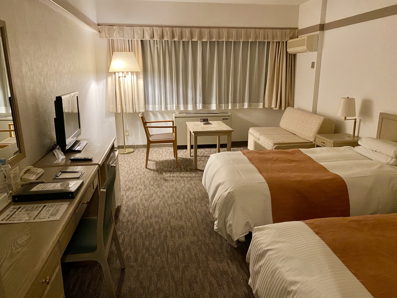 ツインベッドルームは海側でした。テーブルと椅子もあり、まずまずの広さでした。バス&トイレルームはビジネスホテルよりは広い程度。テレビ(BSは入らず)は小さめで、冷蔵庫はあります。ポットとお茶のティーバッグはありますが、コーヒーはありません。寝間着はガウン式で、スリッパは使い捨て。フリーWi-Fiは快適に入りました。クローゼットはなく、ハンガーにかけるフックのみ。