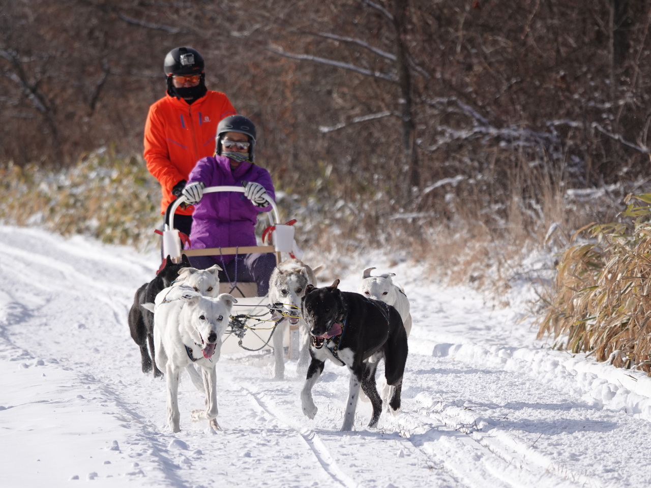 犬ゾリ初体験を楽しみにしてましたが、雪不足で前日までヒヤヒヤ。