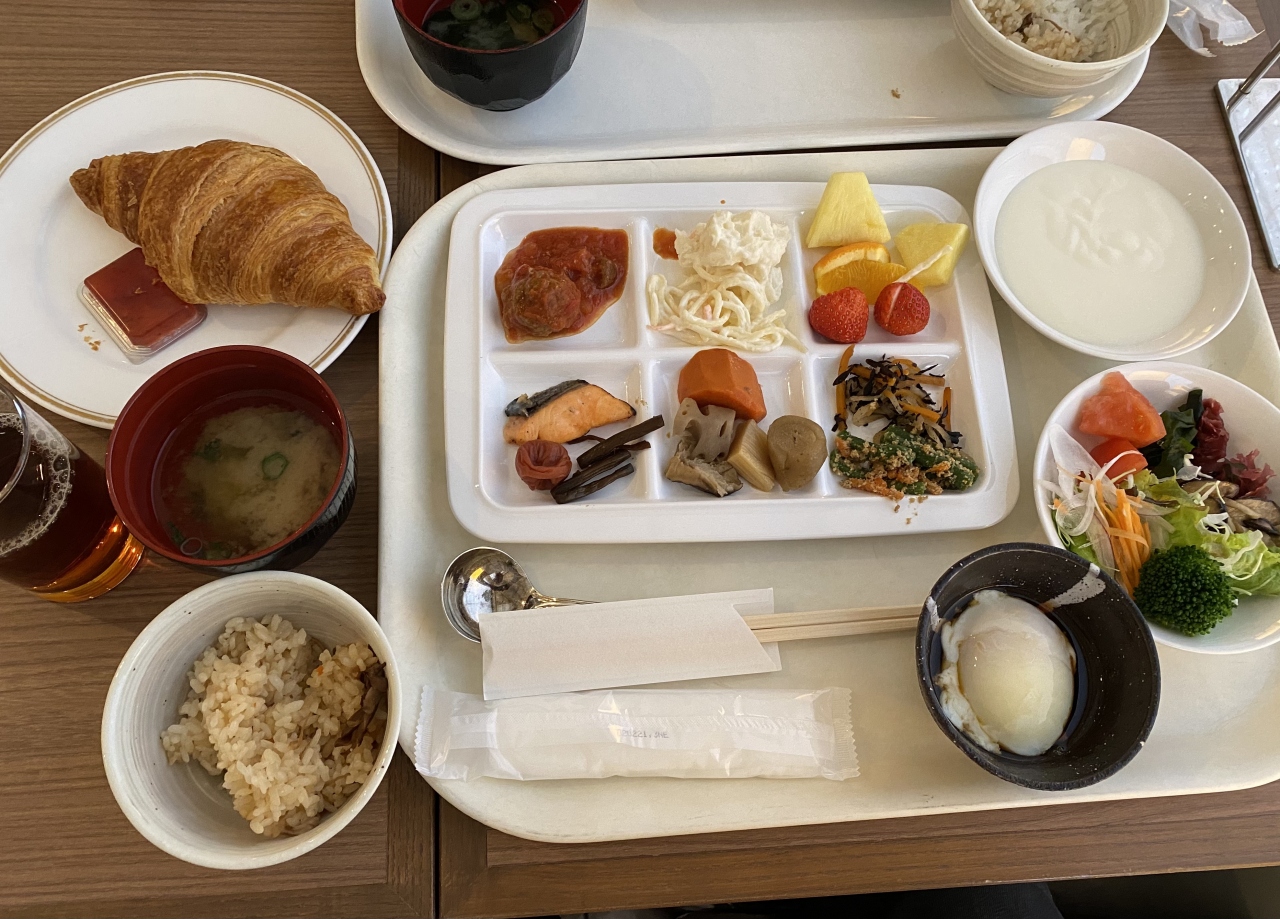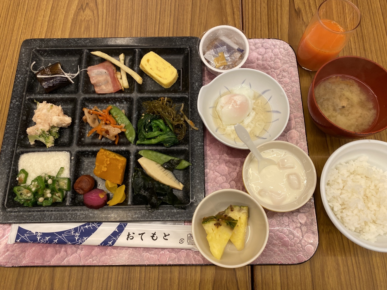 朝食は、小鉢に入ったものを取っていくスタイルのブッフェで、3日で一巡するので3泊以内なら毎日違うものを食べられます。手袋、マスクの使用は必須となっています。