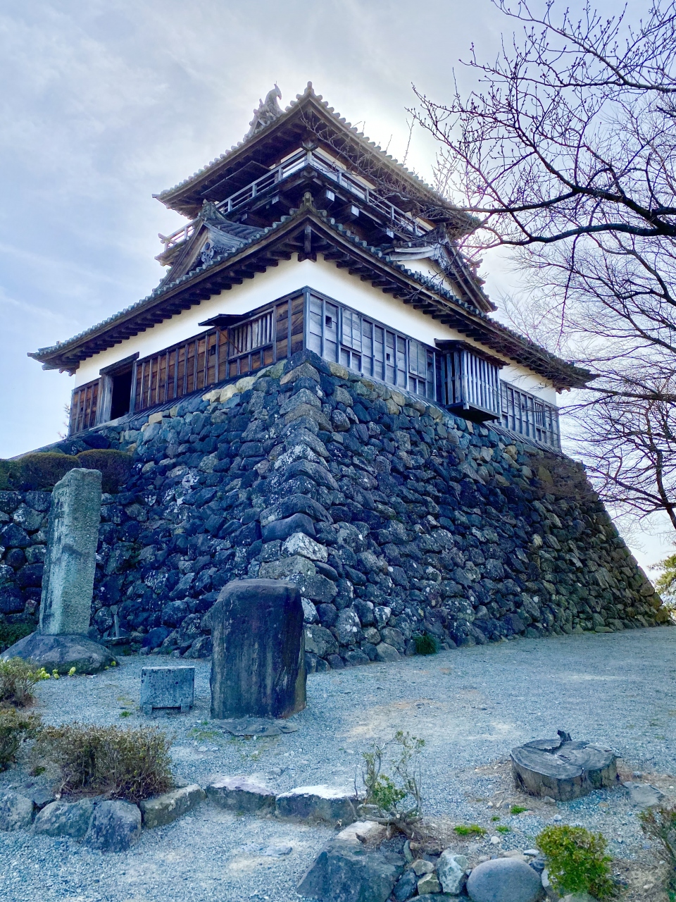 まずは階段を少し登ると、すぐにお城の全貌が姿を現します。素朴ですが味わいのある表情です。石垣の前にある石碑に