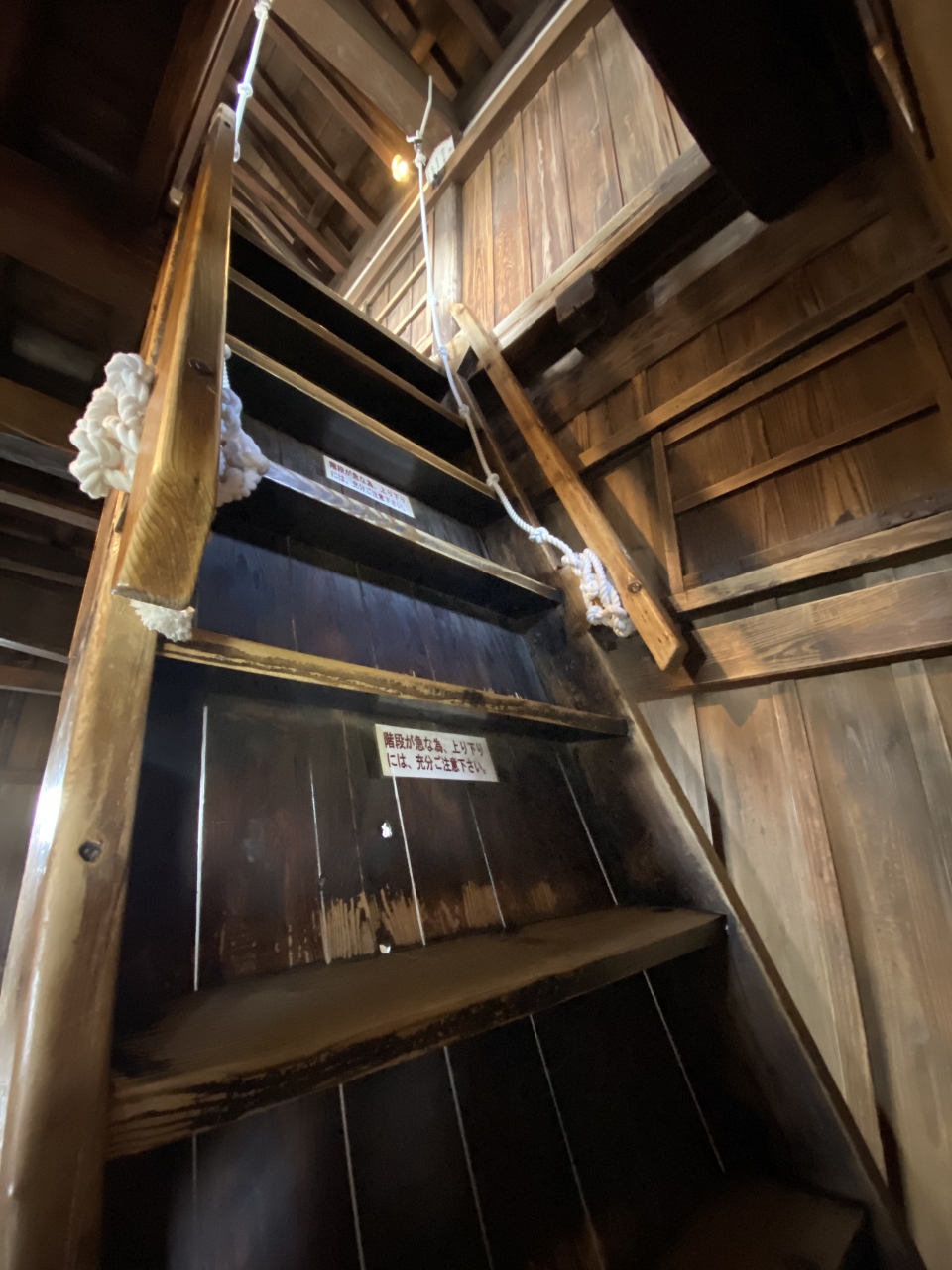 急な石段を登って城内へ。2階は1階からの通し柱がない構造。破風の窓から外が見られます。