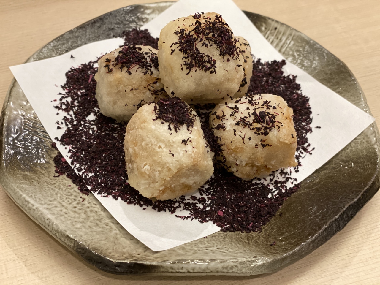 おにぎりは、大きな一つを3分割してあり、独特のフォルムが楽しめます。中身も色々入っているので美味しく、〆の一品にお勧めです。
