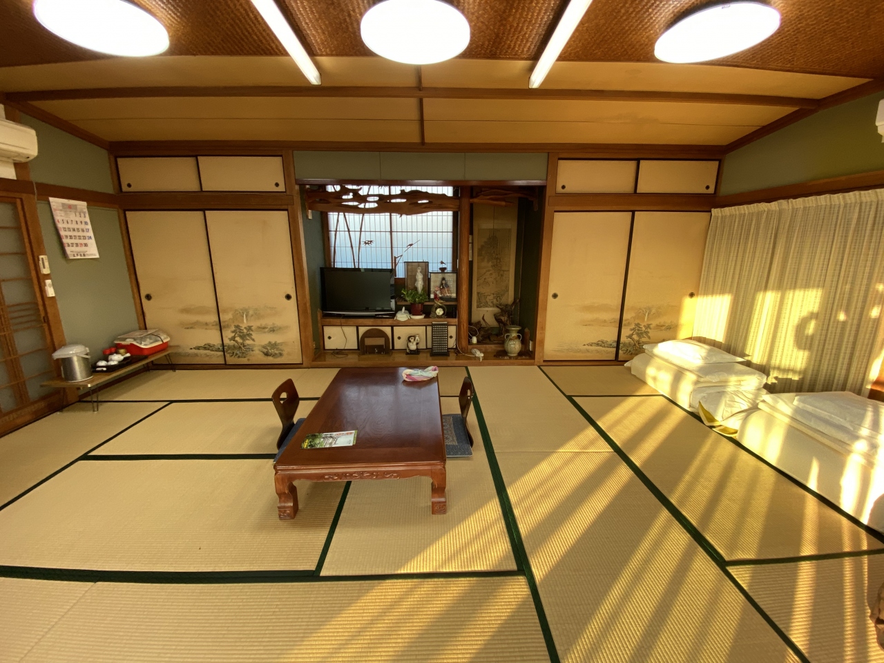 当日の利用者は2人だけだったので、3階の一番広い部屋になりました。縁側からは海も、由布岳も別府ロープウェイのある鶴見岳も見えました。タバコは縁側の外(よく言えばバルコニー)に出て吸えます。