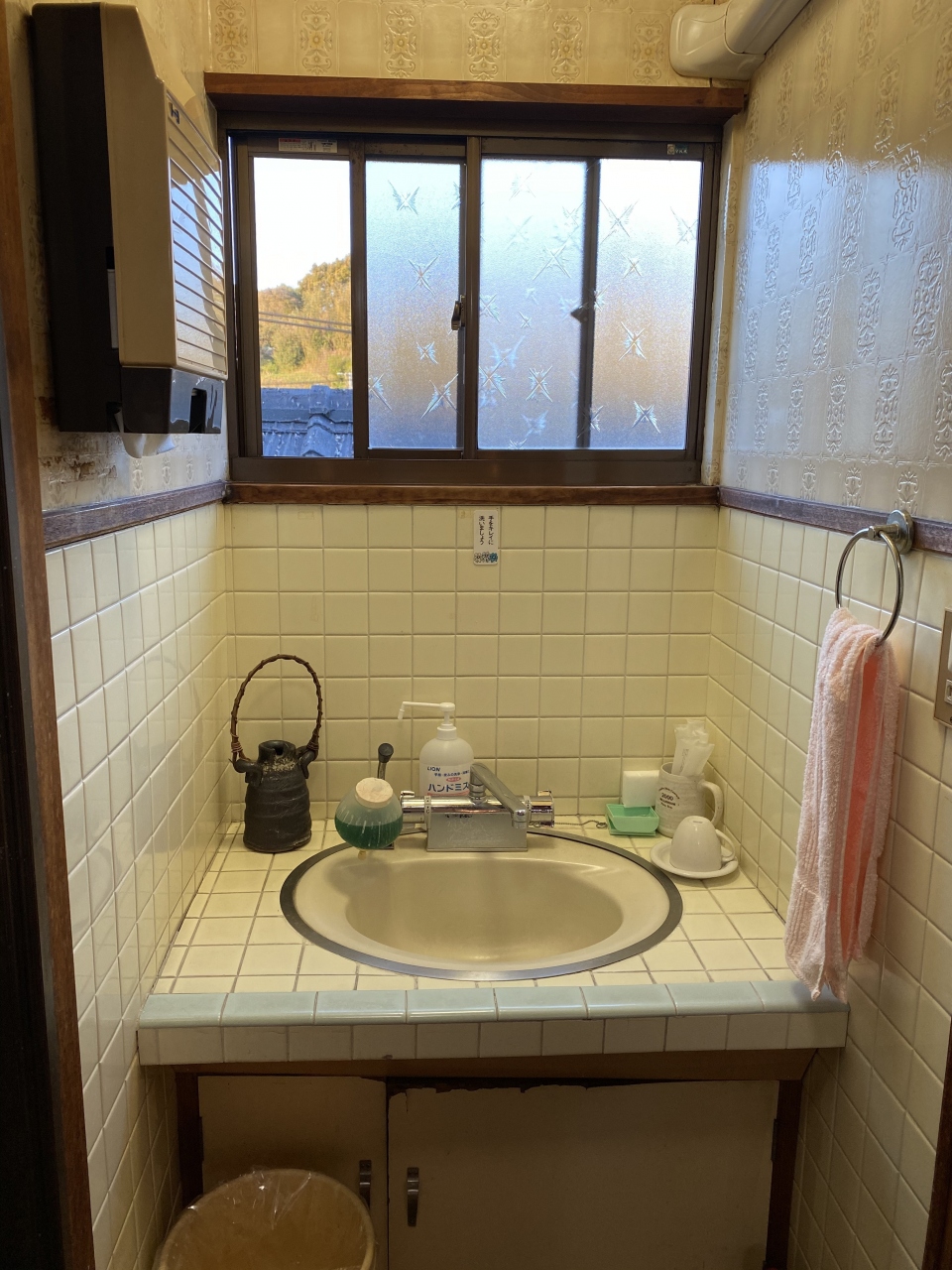 トイレは廊下の外に男性用と女性用があり、ウォシュレットもついていました。洗面所は昔の家にあったような感じの簡素なものです。