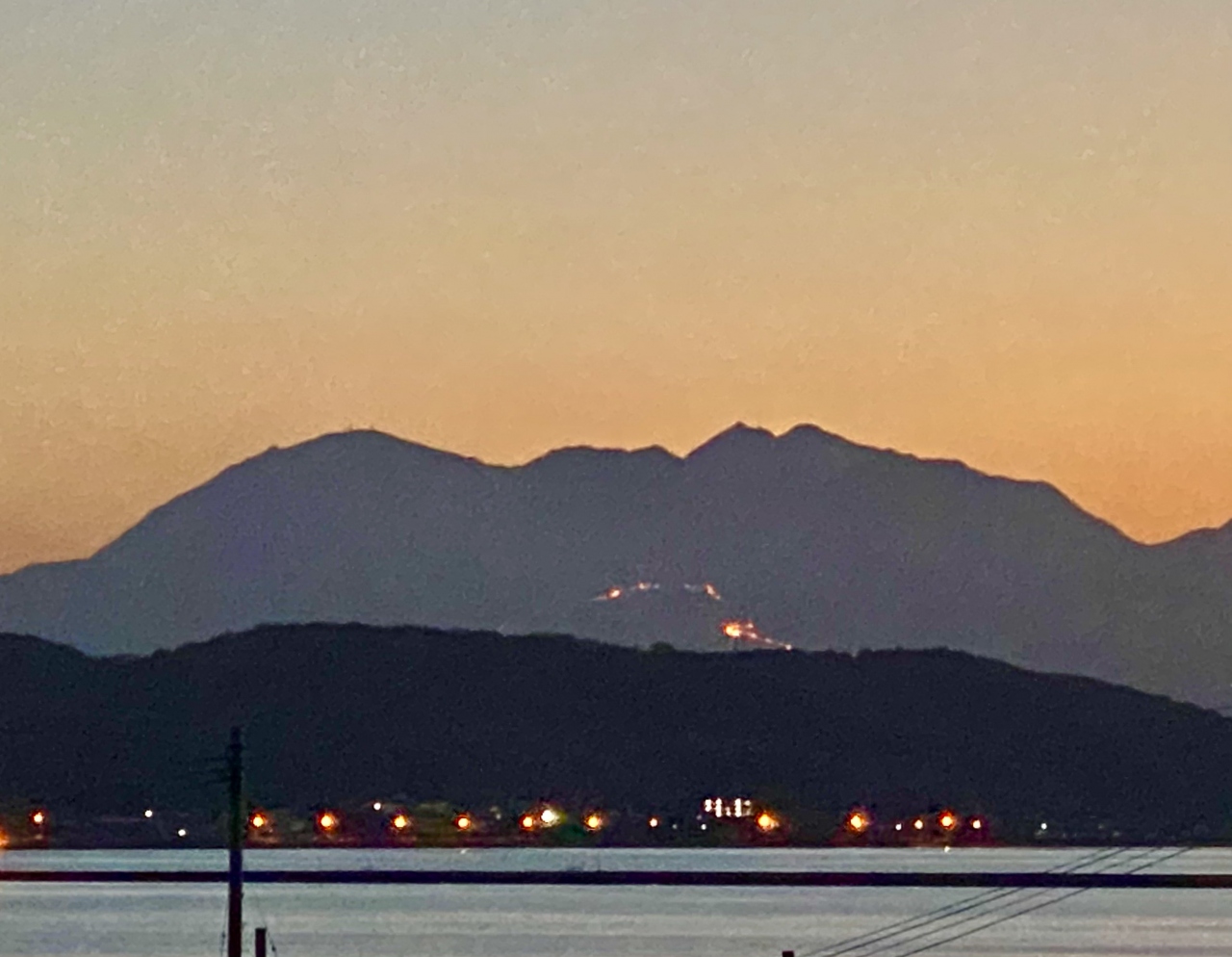 夕食の途中で、由布岳の下部で山焼きが始まったのを教えてもらい、縁側から眺められました。- 旅行時期