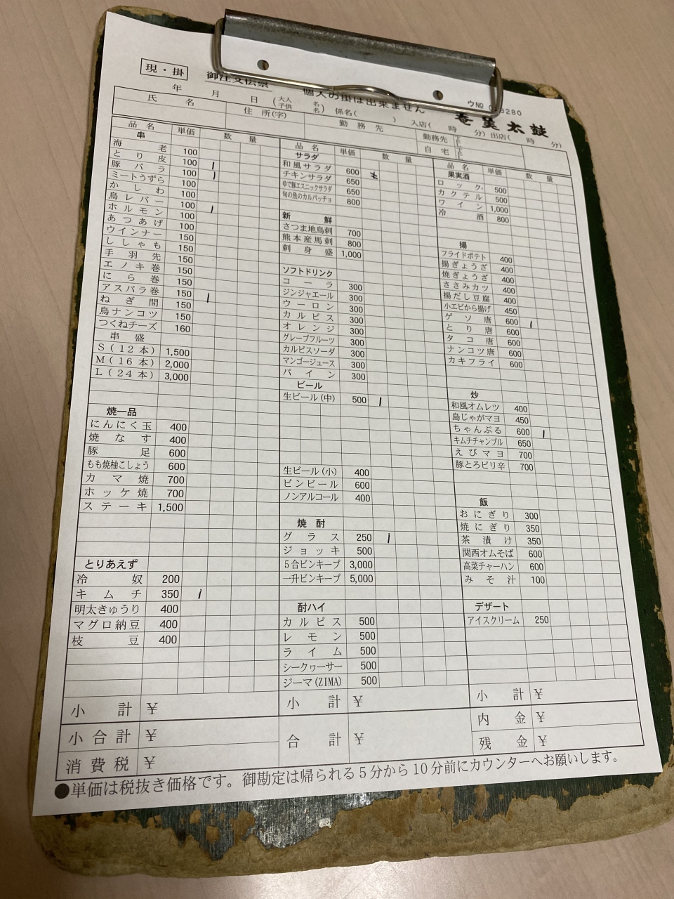 オーダーは、明細書に自分で正ちゃんマークをつけて行く方式で、合理的だと感じました。
