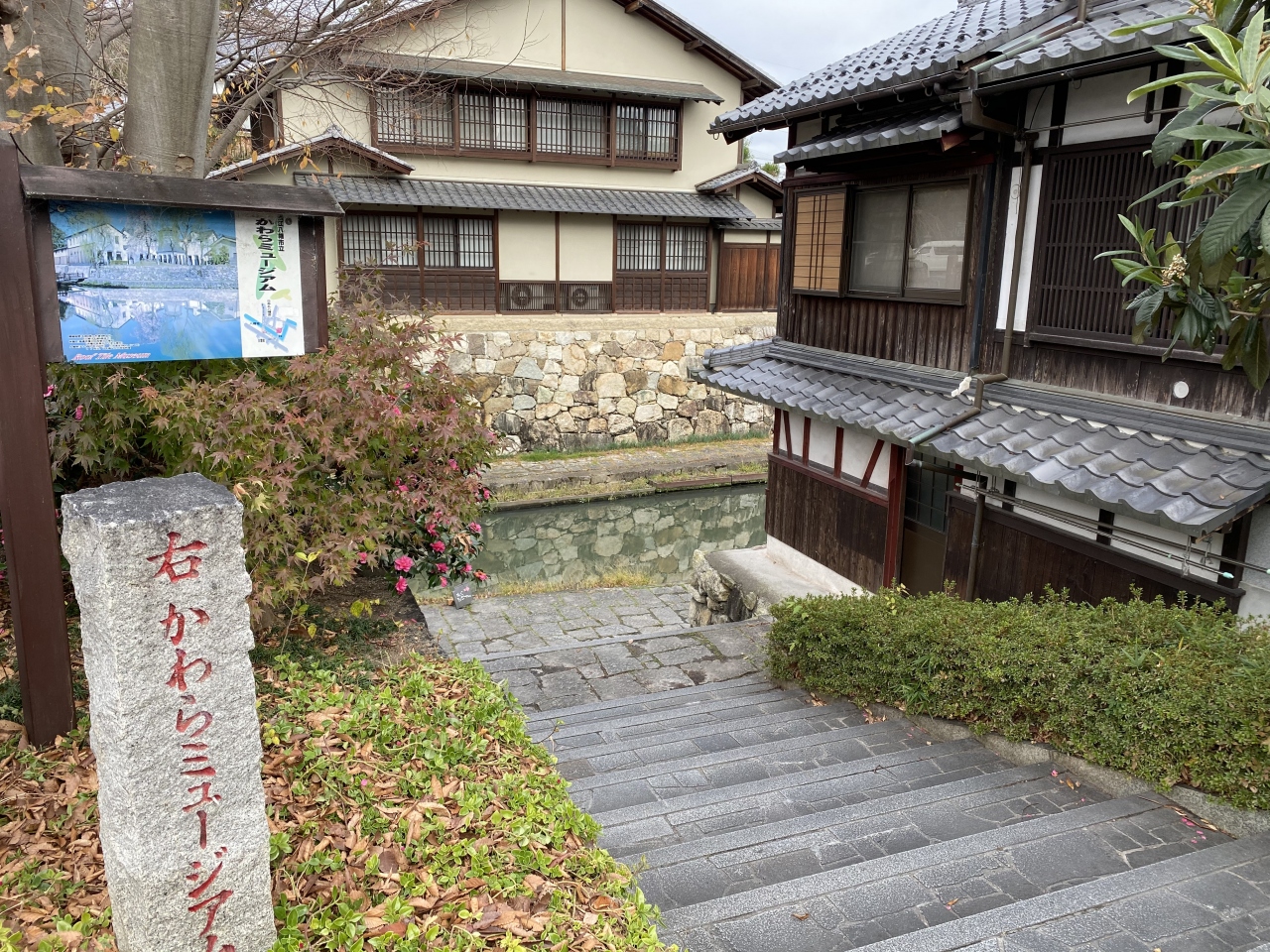 橋を下ると遊歩道があり、かわらミュージアムもあります。その隣には堀沿いにテラス席があるカフェがあったので、堀巡りの船を眺めながらランチタイムにしました。- 旅行時期