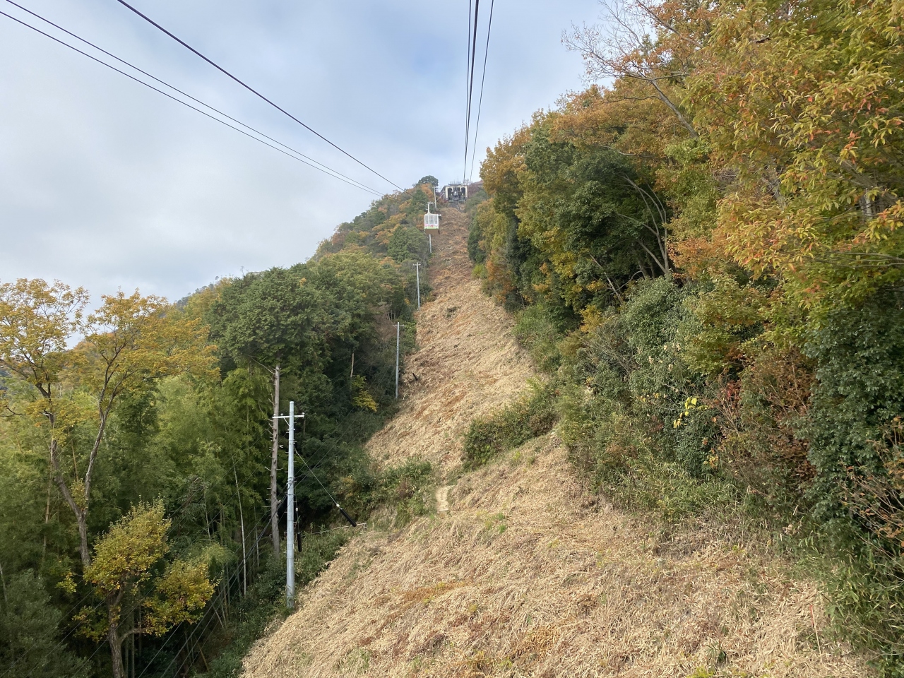 近江八幡駅を出て左に進むと6番のバス停へ。そちらから長命寺行きに乗り、ロープウェイ口で下車しました。街中のバス通のバス停なので、下車して少し戻って歩き、日牟禮八幡宮の木造りの鳥居をくぐると、山頂に向かうロープウェイが正面に見えてきます。乗り場は神社の先の右にある建物です。