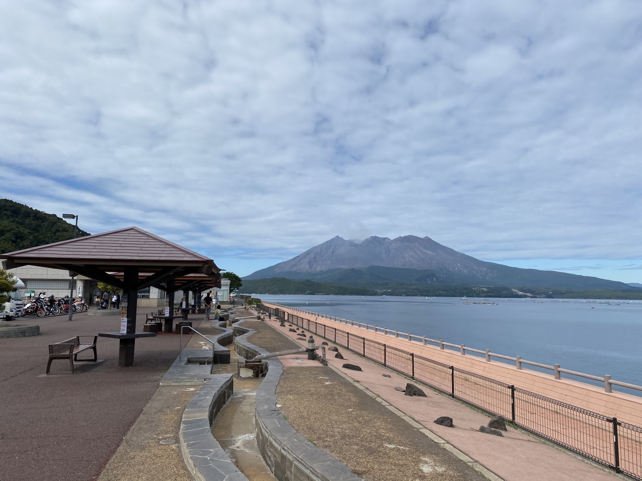 今までは鹿児島市内方向からと、国分方向からしか見たことなかった桜島を、いわば裏側から見るのは初めてでした。駐車場からだけでなく、遊歩道を先の方まで進むと、橋も見えます。霧島連峰も横に並んで綺麗でした。