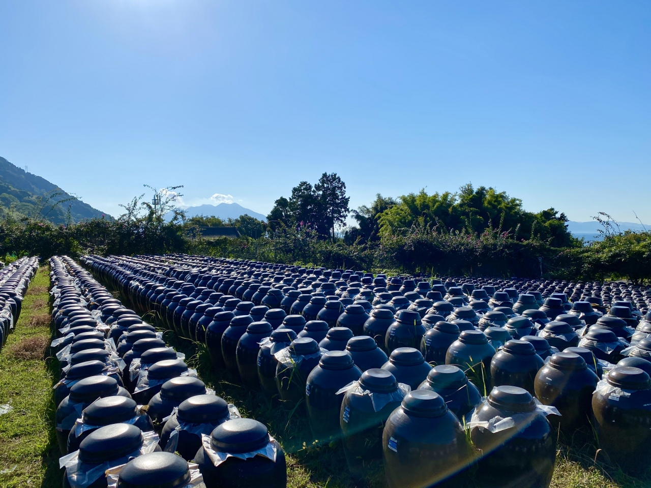 比較的新しい建物で、1Fはショップ、2Fがレストラン。カラフルな亀壺の間を抜けて1Fの裏側に出ると、広大な敷地にびっしりと並ぶ亀壺は壮観で、背景に桜島も少し見えます。2Fのレストランからは桜島がもっと見えます。