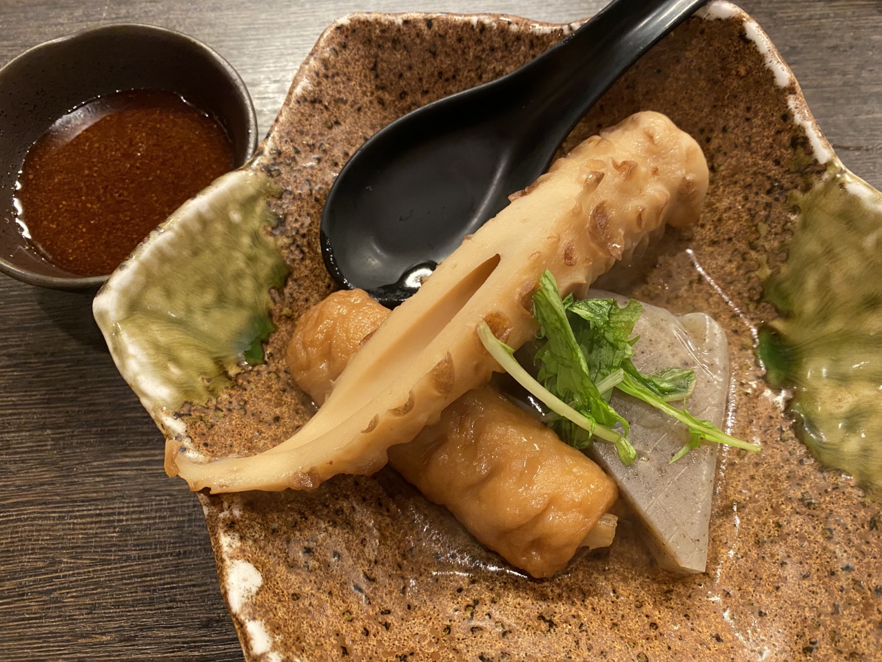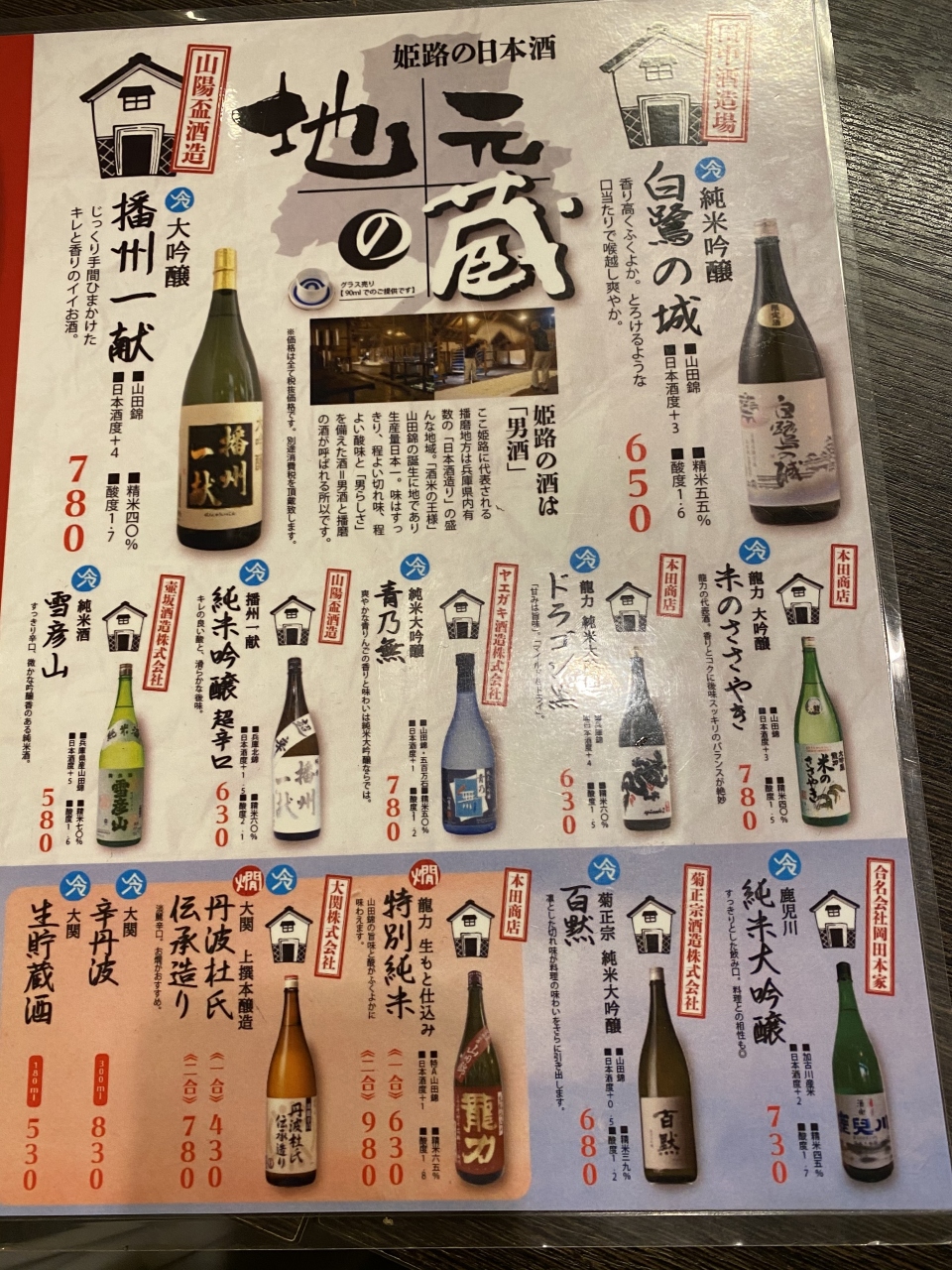 どこの店でも外のメニューに「姫路おでん」がありました。初めて聞く名前でしたが、生姜醤油で食べるスタイルでした。安い店なのでチューブ生姜なのは仕方ないですが、薬っぽい味がするので、普通に食べた方が美味しいと思いました。