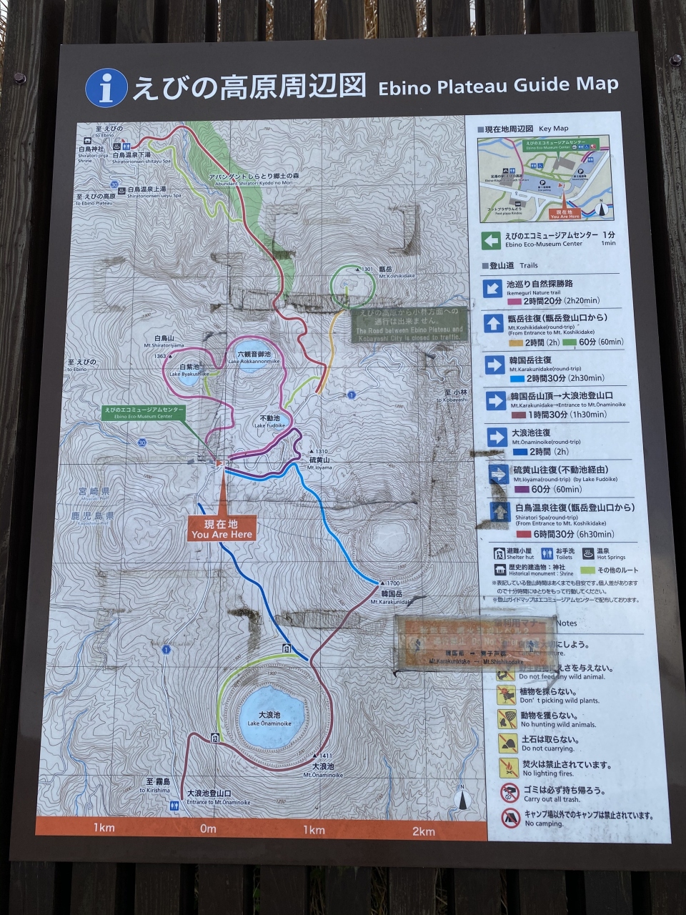 大浪池登山口の駐車場は、とめられる台数が少なく、トイレも現在は台風で故障して使えません。こちらの駐車場は大きいですし、トイレやセンターもありますし、天候がよくない時の代替えルートも色々とありますので、えびの周辺で歩くなら、こちらをお勧めします。- 旅行時期