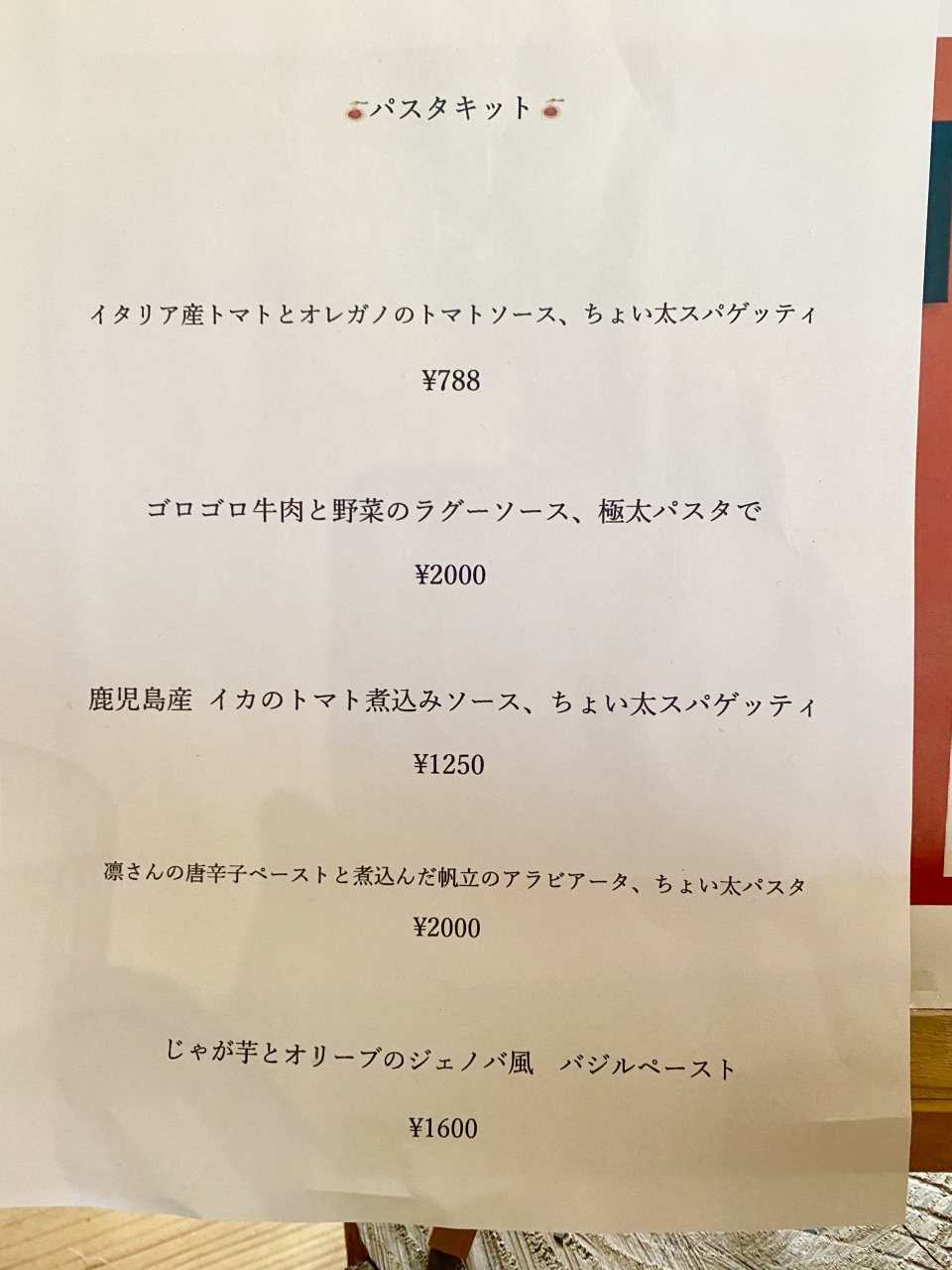 お持ち帰りメニューもあり、家で温めるだけで食べられるパスタなどが数種類ありました。