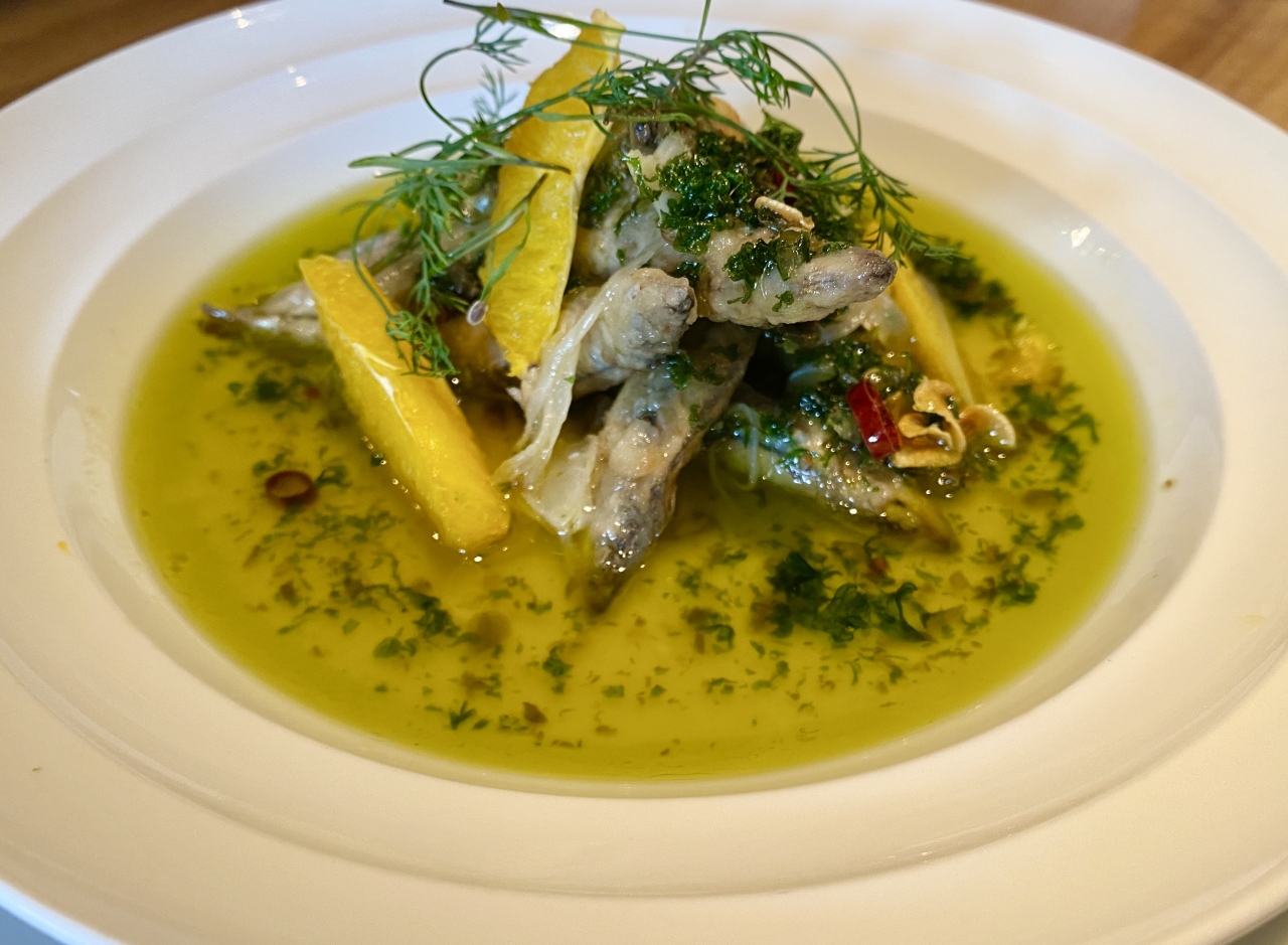 キビナゴのカルピオーネは、オリーブオイルにどっぷり浸かってきましたが、オレンジの風味が程よく効いていて、見た目と違ってさっぱりとした味わいでした。