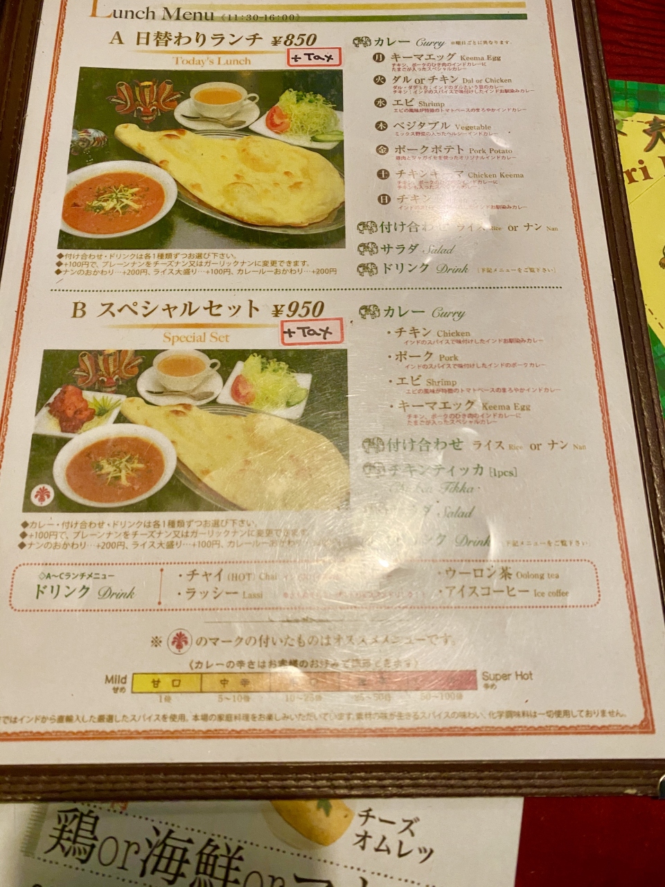 ランチで行きましたが、サラダやドリンクがついて、ご飯かナンが選べるセットメニューが色々とあって選択肢が多いです。
